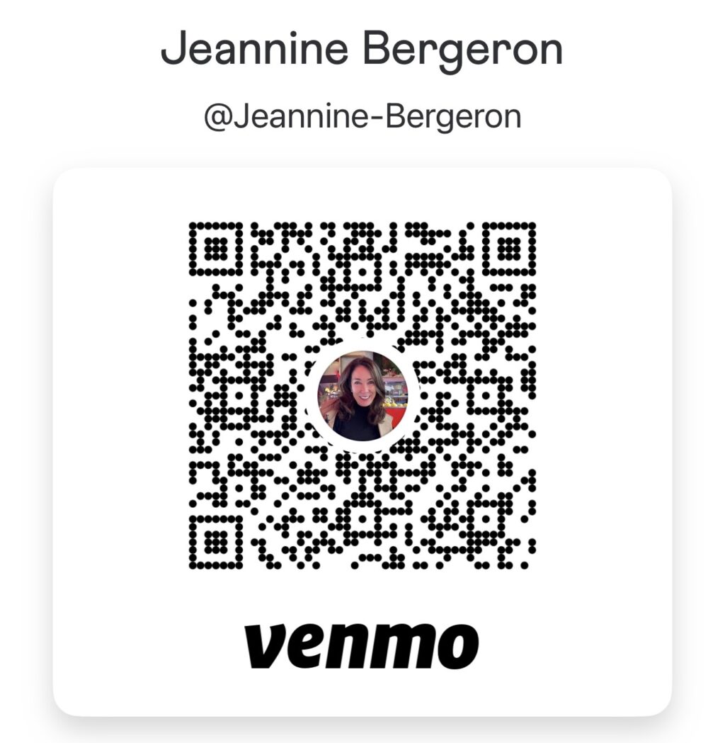 Send a $25 payment via Venmo to @jeannine-bergeron or use this link to my Venmo profile or scan the QR code below.